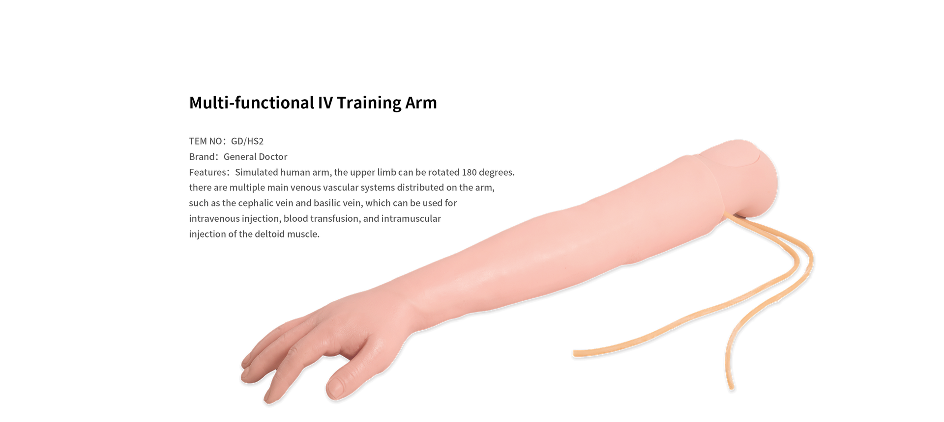 The GD Multi-Functional IV Training Arm Model (GD/HS2) is a realistic clinical training simulator designed to teach and practice intravenous therapy, venipuncture, and intramuscular injection techniques. The model replicates the anatomical structure of a human upper limb and allows the arm to rotate up to 180 degrees, enabling trainees to practice vascular access procedures in multiple clinical positions.