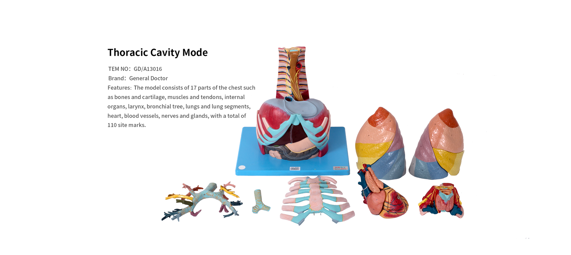 The model is composed of 17 detachable parts, representing key structures of the thoracic region such as the rib cage, cartilage, muscles, tendons, larynx, bronchial tree, lungs with lung segments, heart, blood vessels, nerves, and glands. A total of 110 labeled anatomical sites are marked on the model, allowing students and educators to identify and study detailed anatomical features with precision.
