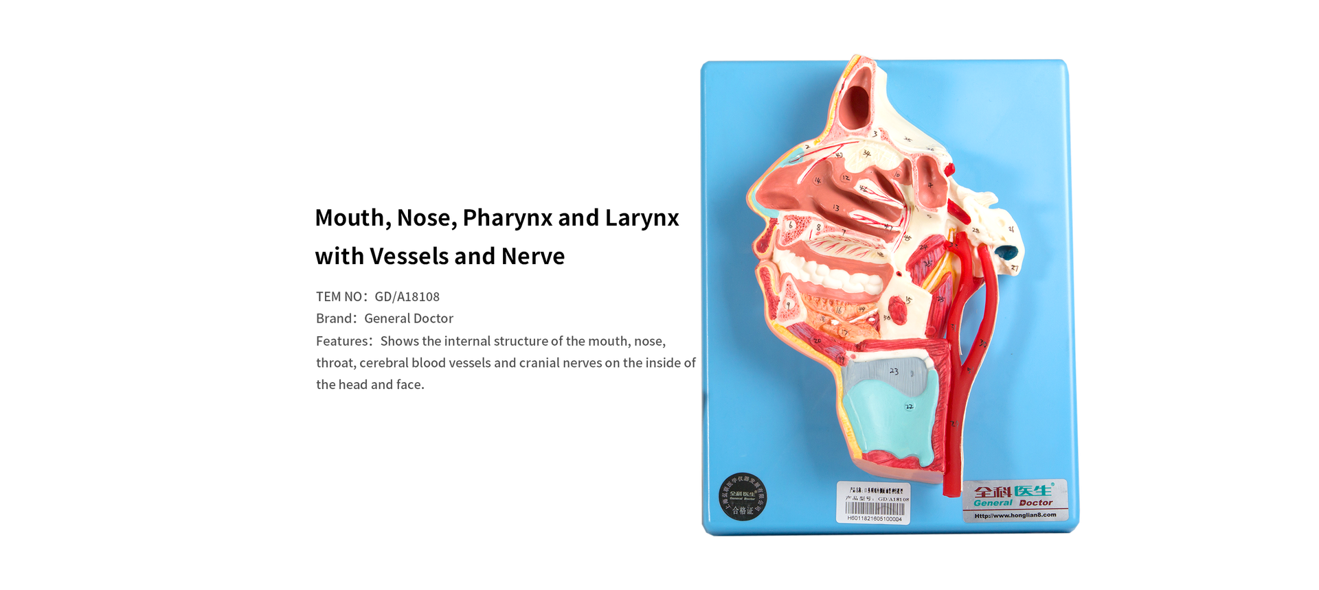 The GD Mouth, Nose, Pharynx and Larynx with Vessels and Nerve Model is a detailed anatomical teaching model designed to illustrate the internal structures of the oral cavity, nasal cavity, pharynx, and larynx, along with the associated vascular and nerve networks. This model provides a clear view of the anatomical relationships within the upper respiratory and digestive pathways, making it a valuable educational tool for studying head and neck anatomy.